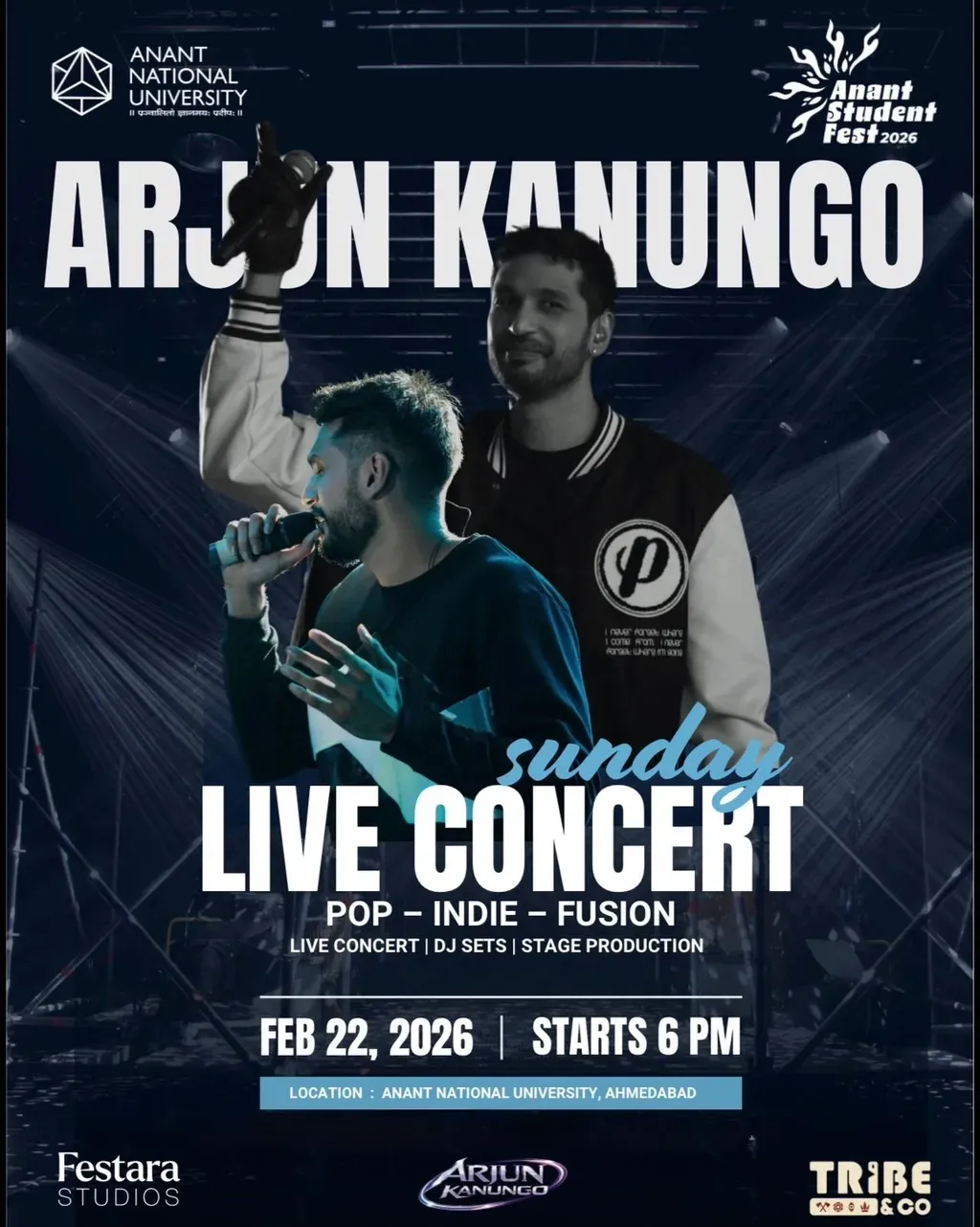 ๐ถ Live Concert by Arjun Kanungo | Anant Student Fest 2026 Get ready for an electrifying Sunday night of live music, energy, and unforgettable vibes as Arjun Kanungo performs live at Anant National University, Ahmedabad as part of Anant Student Fest 2026. Experience a power-packed Pop โ Indie โ Fusion concert featuring soulful melodies, high-energy performances, and world-class stage production. Whether youโre a die-hard fan or a live music lover, this concert promises an immersive musical journey you donโt want to miss. ๐ Location: Anant National University, Ahmedabad