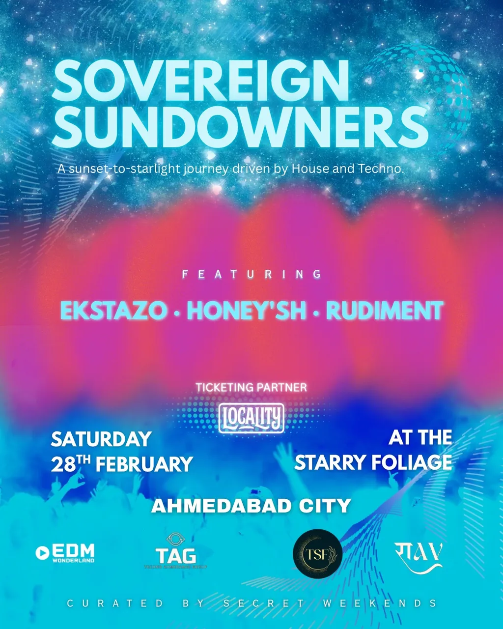Sovereign Sundowners is a sunset-to-starlight musical journey bringing together the finest sounds of House & Techno in Ahmedabad. Set against the beautiful ambience of The Starry Foliage, this experience blends immersive visuals, curated energy, and a lineup designed to move you from golden hour into the depths of the night. Featuring Ekstazo, Honey’Sh, and Rudiment — expect driving basslines, hypnotic drops, and a crowd that lives for the rhythm. This isn’t just another party. It’s a carefully curated Sundowner experience. Limited Early Bird tickets available for 48 hours only. Secure your passes now and be part of the movement.